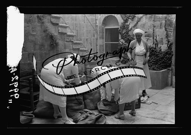 Title: The raising of the siege of Jerusalem. Court-yard of the Anna Spafford Baby Home showing Mrs. Vester & nurses with baskets of bread for distribution among the poor of the quarter