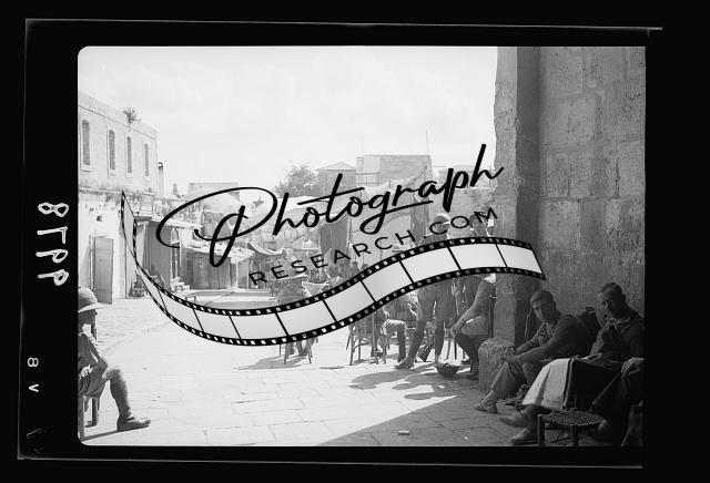Title: The raising of the siege of Jerusalem. Typical scene of troops in Old City before the lifting of curfew. Old Moorish house close to the temple area, gutted with fire during the day of curfew