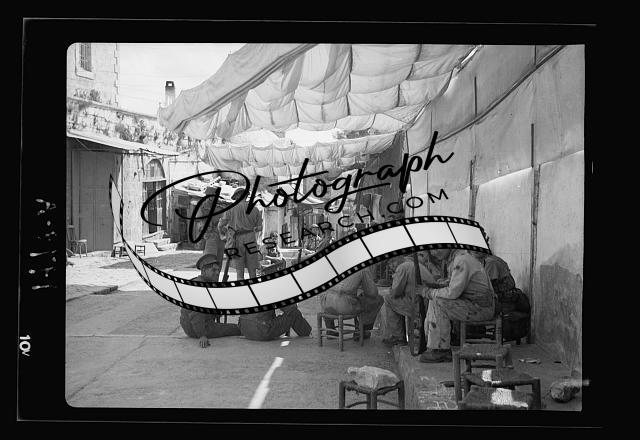 Title: The raising of the siege of Jerusalem. Typical scene of troops in Old City before the lifting of curfew. Scene of troops inside the Damascus Gate
