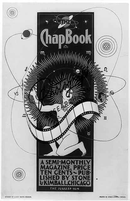 Poster advertisement for THE CHAPBOOK, showing "The Juggler Sun", a personification of the sun juggling the planets in orbit