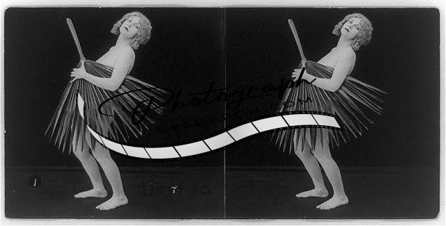Summary: Scantily clad young woman wearing elaborate headdress and holding sword or large knife lying on sofa.