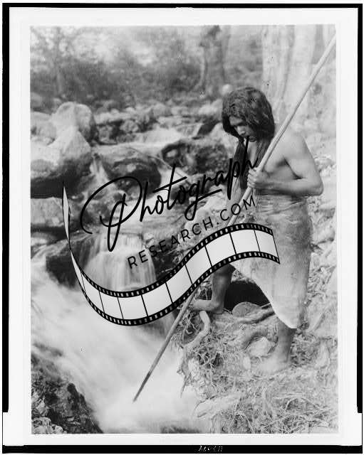 Watching for Salmon,Hupa Indian man with spear,gazing into stream,California,CA