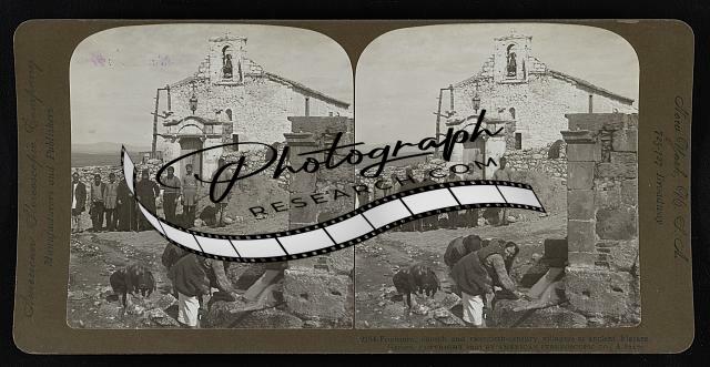Fountain,church,twentieth-century villagers at ancient Plataea,Greece