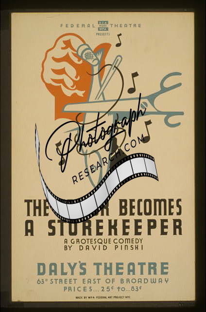 Summary: Poster for Federal Theatre Project presentation of 'The Tailor Becomes a Storekeeper' at Daly's Theatre, 63rd Street east of Broadway, New York City, showing a hand holding a fish being cut in half with sissors.