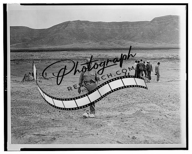 Gen. Leslie R. Groves, full-length portrait, walking over atomic bomb blast area in Alamogordo, N.M.