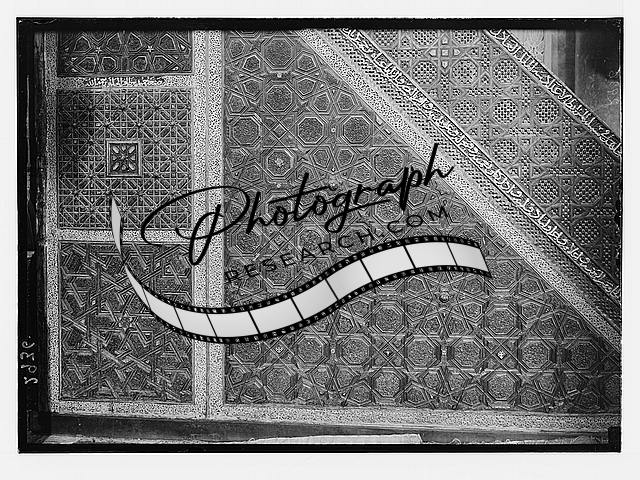 Title: The Temple area. Mosque el Aksa [i.e., al-Aqsa], int[erior]. Chapel of Omar. Reader before Omar's mihrab made of Byzantine entwined columns.