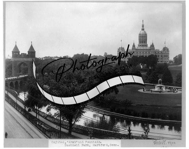 Capitol,arch,fountain,Bushnell Park,Hartford,Connecticut,c1900,Hartford County