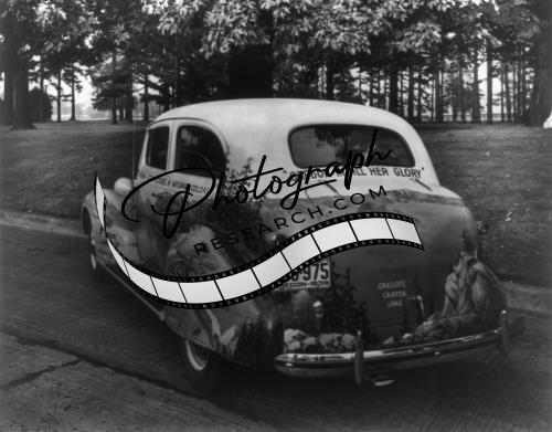 Visual state advertising;pictorial description of Oregon on automobile,OR,c1940