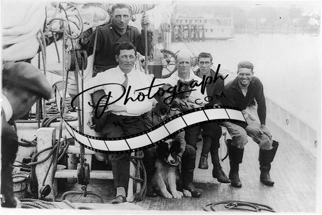 Crew of Arctic ship Bowdoin,c1922,men and dogs on deck of ship