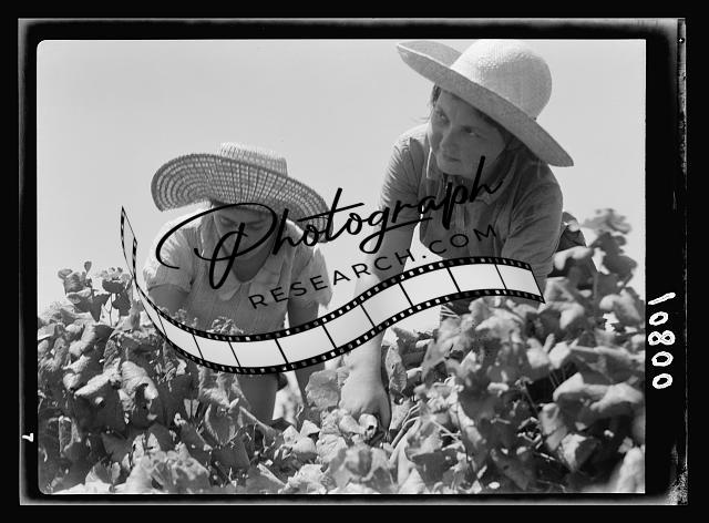 Title: The vintage season Zikh'ron Ya'aqov, July 24, 1939. Two girls pause to giggle & to sample the sweetness of the vine. Sampling grapes during a short pause