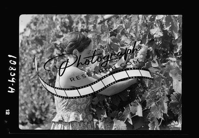 Title: The vintage season Zikh'ron Ya'aqov, July 24, 1939. German immigrant girl of cultured family (Mrs. Levi), a luscious bunch in hand