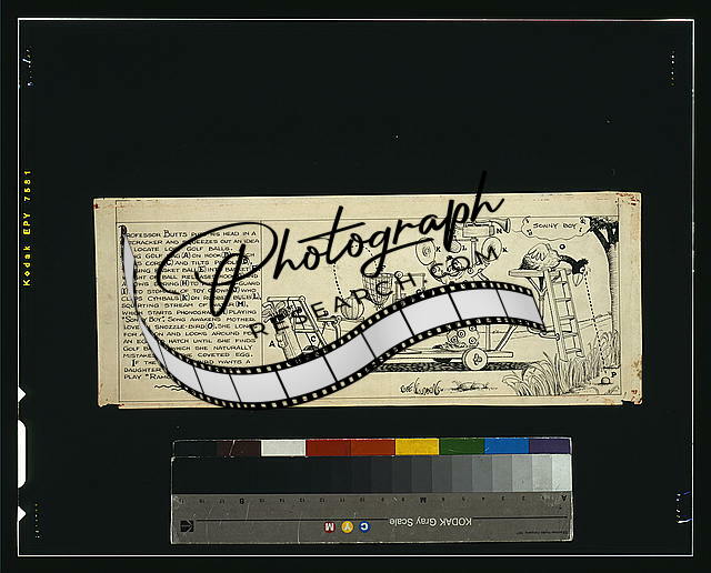 Rube Goldberg's inventions]. Professor Butts puts his head in a nutcracker and squeezes out an idea to locate lost golf balls