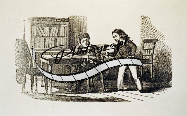 2 boys in library,with one at table with book,c1840s,Alexander Anderson,Photo