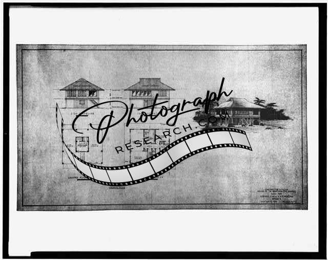 Officers' quarters ("single N.C.O. quarters" and "single C.O. quarters"), Canal Zone, Panama. House on stilts - perspective, elevation, and plan
