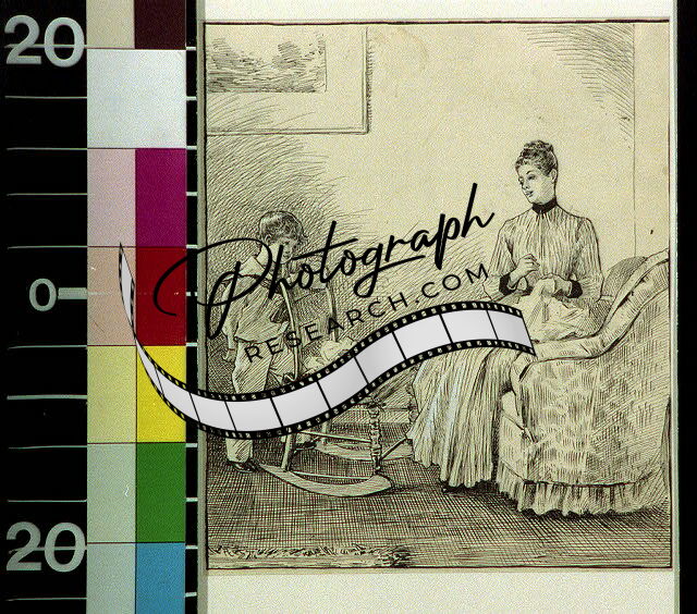 Woman sitting on sofa talking to child next to rocker,Rosina Emmet Sherwood,1888