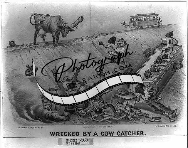 Wrecked by a cow catcher,Darktown Comics Photo,c1885,Trolley Cars,people