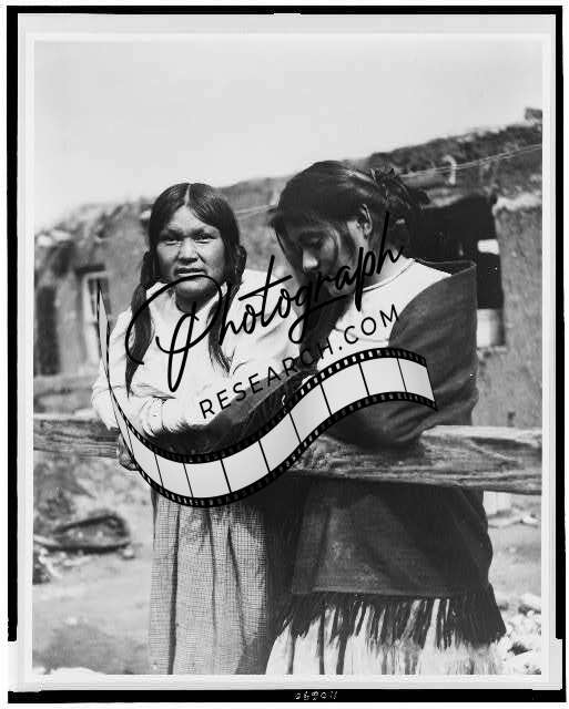 Two Indian women standing,adobe building 1920's