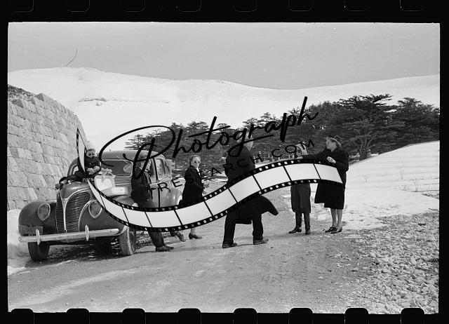 Cedars. Photographic party stops for a cold snowy lunch,Lebanon,March 1946,5