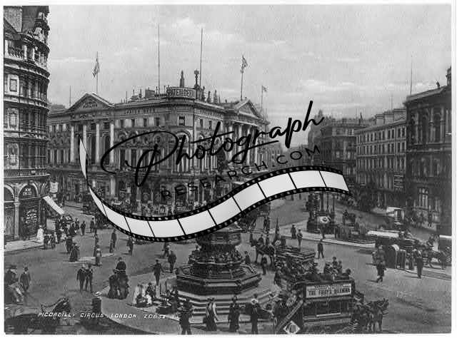 Piccadilly Circus,London,England,pedestrians,fountain?,horse drawn carts