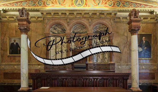 Courtroom is from the previous building built in 1896. It was disassembled and reassembled in the new building in 1932. It contains over 30 types of marble. Behind the bench is a frieze of 10 female figures depicting the purity of justice.