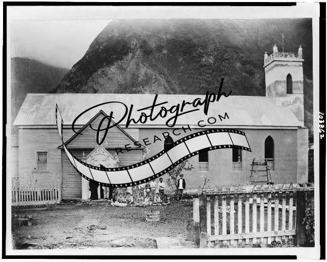 Men,boys,front,church,Father,Saint Damien,churches,religious buildings,c1939