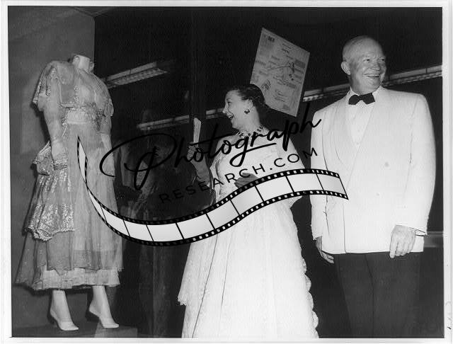 Memories,President Eisenhower turns,laughing,Mamie Doud,wife,wedding gown,1955