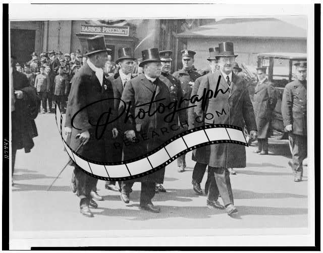 Several men in top hats,overcoats leave harbor precint,1910-1930,Cane