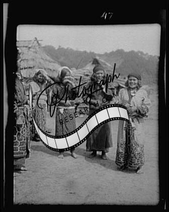 Two Ainu woman,holding child,outside,villages,buildings,nitrates,A Genthe,1908