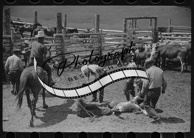 Branding calf,Quarter Circle U Ranch roundup,Montana,MT,Arthur Rothstein,1939