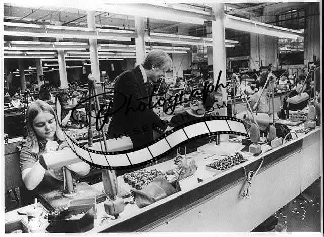 Jimmy Carter campaigning in a factory. Shaking hands with woman making costume jewlery