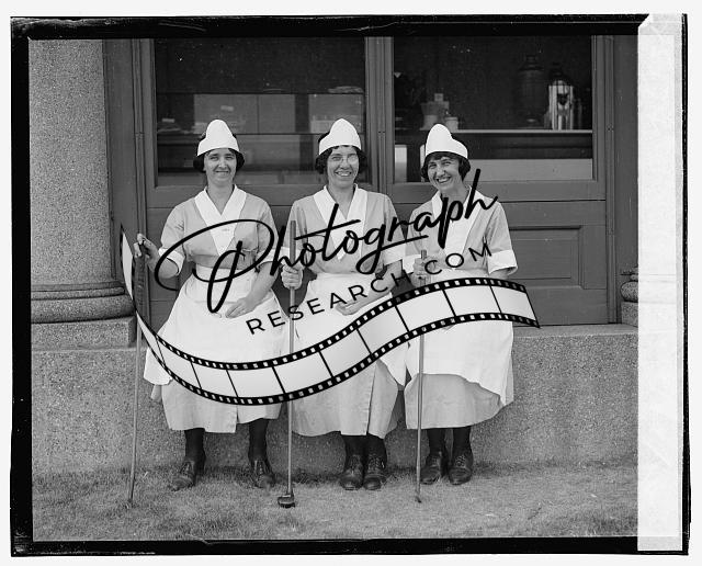 Three women wearing uniforms holding golf clubs,6/29/23,June 1923
