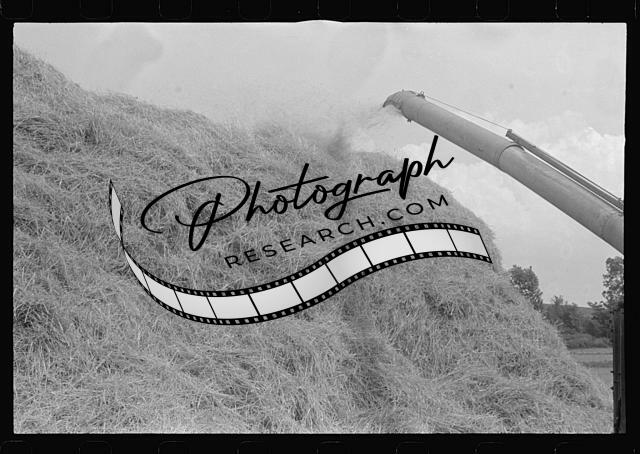 Wheat straw being piled by cyclone stacker,central Ohio,OH,Summer 1938,FSA