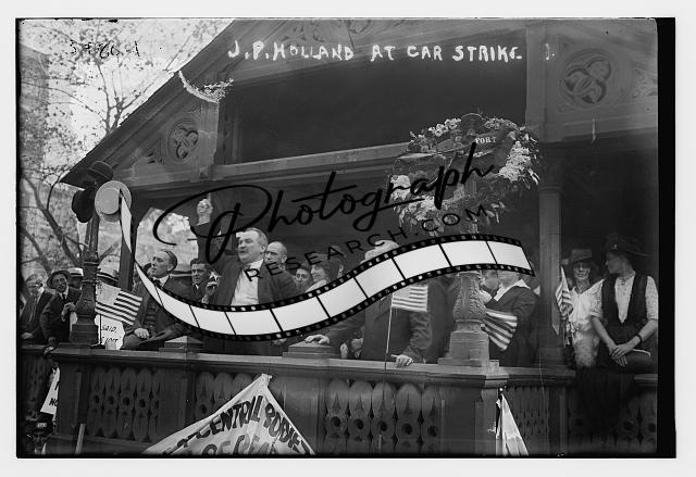 J.P. Holland at car strike,American flags,wreath,people,Bain News Service