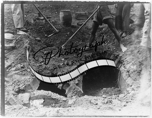 China or Manchuria,ca. 1900: workers with picks atop excavated grave