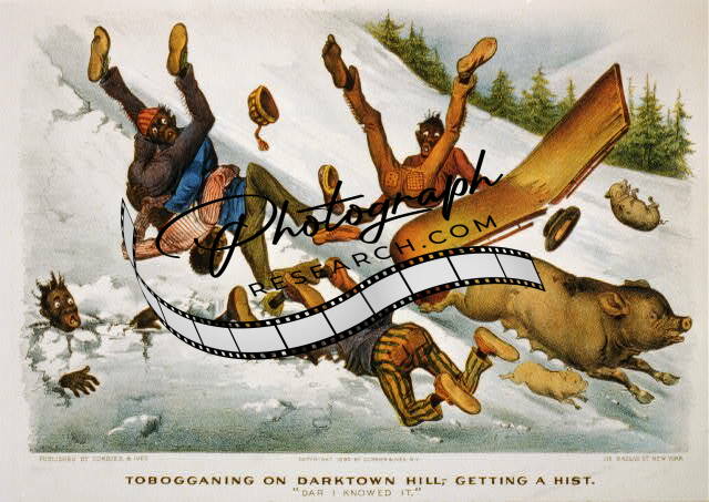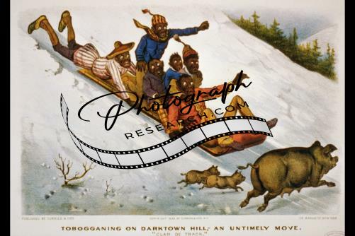 Tobogganing on darktown hill,Darktown Comics Photo,c1890,pigs,sledding,snow