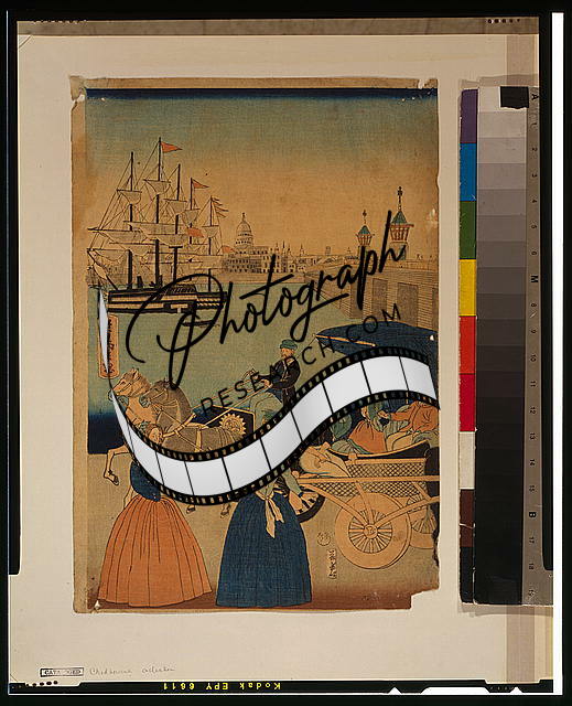 Summary: Japanese triptych print shows various modes of transportation, including a steamboat, steam vehicle, a velocipede, and a cannon being pushed into position by two men, Tokyo, Japan.