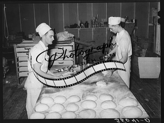 Title: Removing rolls from tray at bakery. San Angelo, Texas