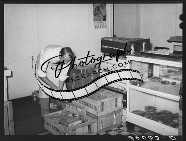 Title: Emptying a sack of flour into the dough mixing machine. Bakery, San Angelo, Texas