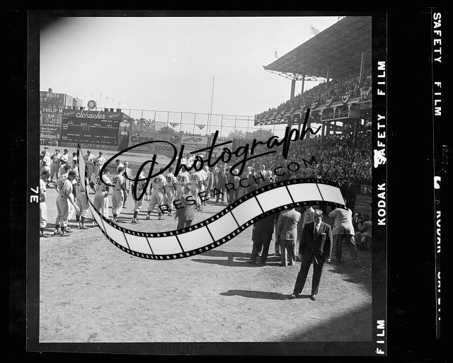 Members of New York Yankees and/or Brooklyn Dodgers baseball teams lining up to greet President Eisenhower on opening day of the 1956 World Series