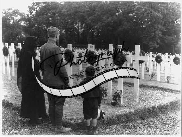 Soldier,woman,boy paying respects at a grave in a military cemetery,WWI,c1919