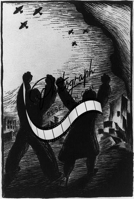 Spanish couple amid burning city,shaking their fists at bombers overhead,c1937