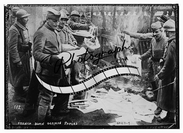 French burn German papers,soldiers,troops,fires,uniforms,men,Bain News Service