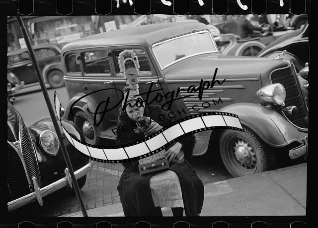 Blind Man on Street with Dog,Parking Meters,Automobiles,Nebraska,NE,FSA