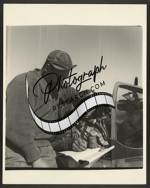 Summary: Photograph shows Deputy Group Commander George S. 'Spanky' Roberts with photographer Toni Frissell, at Ramitelli, Italy, March 1945. Frissell wrote 'Just before take off in stripped down mustang--no guns--for rendezvous with the fighter pilots.' Aircraft is a P-5/D, number 37, with three German crosses in front of the number. It was named 'Marcelle' and was assigned to Group Headquarters. It is shown configured for 'Piggyback.' (Source: Photographer's notes and Tuskegee Airmen 332nd Fighter Group pilots.)