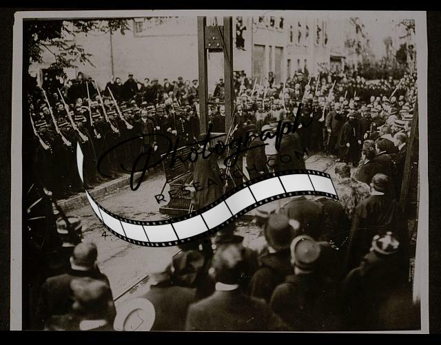 French soldiers form a rectangle around a man being led to a guillotine, Grenoble, France