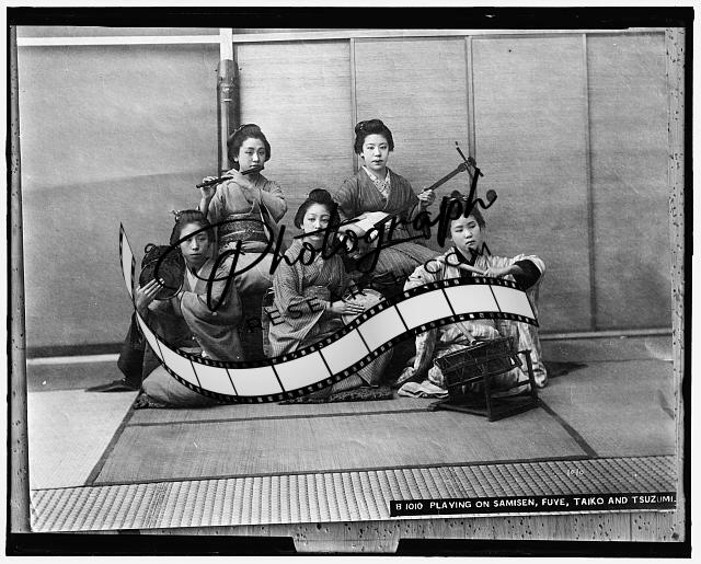 Playing,samisen,fuye,taiko,tsuzumi,musicians,Japanese women,instruments,1910
