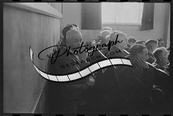 Title: Townspeople listening to discussion during meeting, Woodstock, Vermont