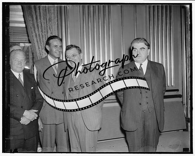 Title: Trans-Atlantic permits handed out. Washington, D.C., April 20. The Dept. of Commerce today awarded permits to the Pan American Airways from Great Britain, Canada and the Irish Free State. These permits are all non-exclusive and convey flying rights in and out of these countries for Trans-Atlantic Air service between New York and London. Left to Right: Sir Herbert Marler, the Canadian Minister; Michael MacWhite, Irish Minister; Sir Ronald Lindsay, the British Ambassador; Juan T. Trippe, President of Pan American Airways who is receiving the permits from the Secretary of Commerce Daniel Roper, 4/20/1937