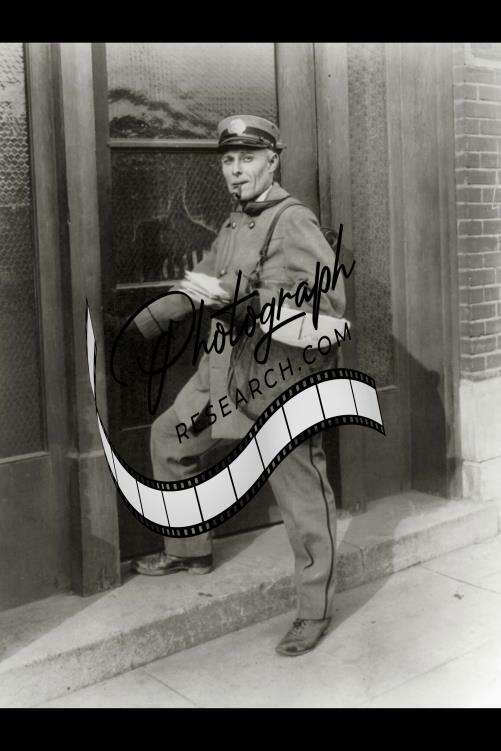 The postman,Postman at door with handful of mail,whistle in his mouth,c1923