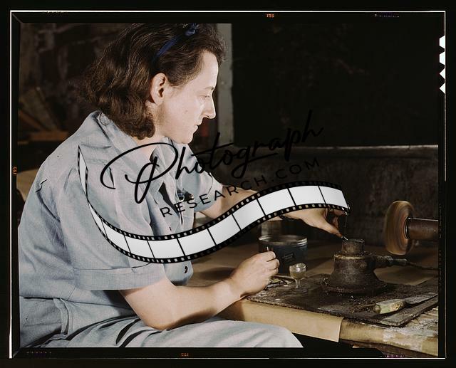 Title: Transfusion donor bottles, Baxter Lab., Glenview, Ill. Formerly a sculptress and designer of tiles, Dorothy Cole converted her basement into a workshop to tin plate needles for valves for blood transfusion bottles prepared by Baxter Laboratories where she lives. She turns in her profits to war bonds to provide a college education for her young nephew